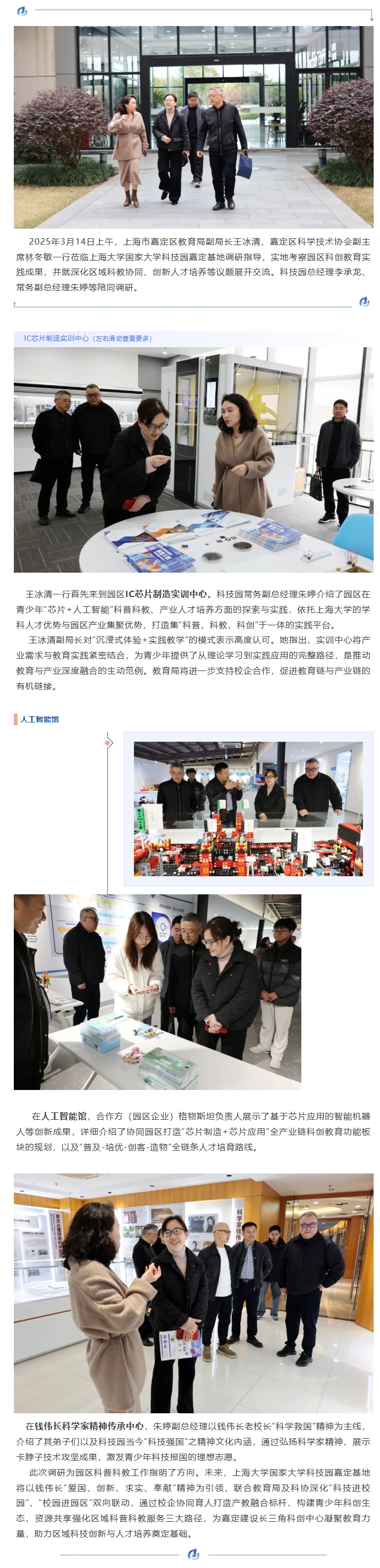 新聞動(dòng)態(tài) News Center 園區(qū)動(dòng)態(tài) | 嘉定區(qū)教育局副局長(zhǎng)王冰清一行調(diào)研上海大學(xué)國(guó)家大學(xué)科技園嘉定基地 2025-03-20